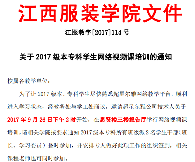【教学科】关于2017级本专科学生网络视频课培训的通知(江服教字【2017】114号)