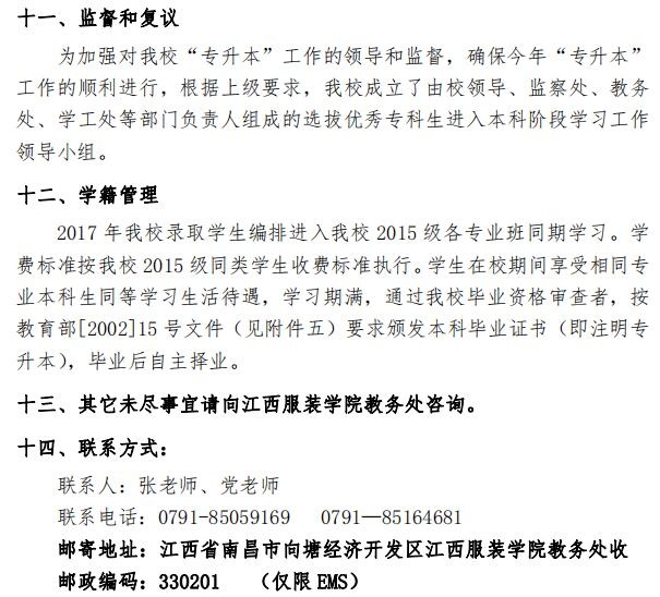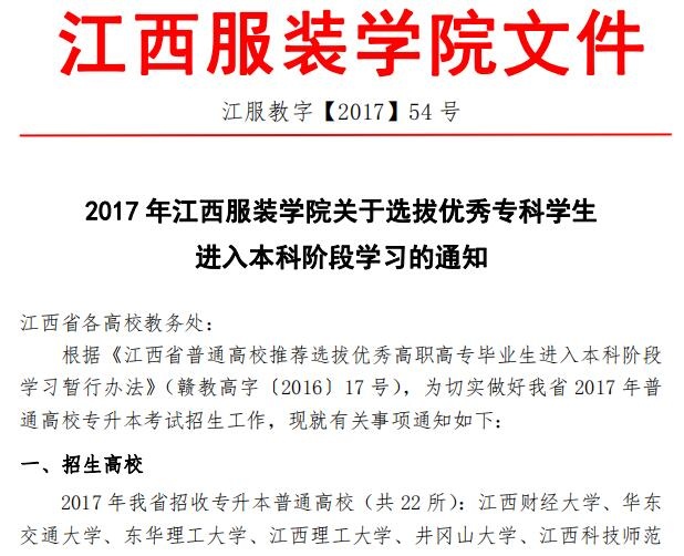 【学籍学位科】2017年江西服装学院关于选拔优秀专科学生进入本科阶段学习的通知(江服教字【2017】54号)