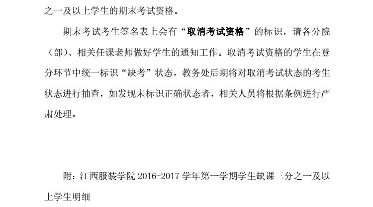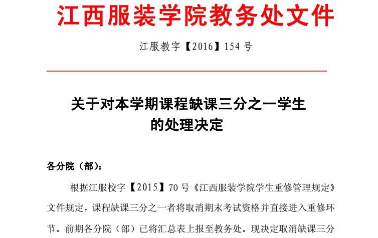 【学籍学位科】关于对本学期课程缺课三分之一学生的处理决定 (江服教字【2016】154号)
