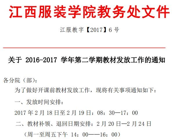 【教材科】关于2016-2017学年第二学期教材发放工作的通知(江服教字【2017】6号)