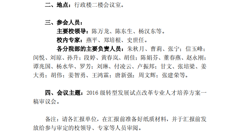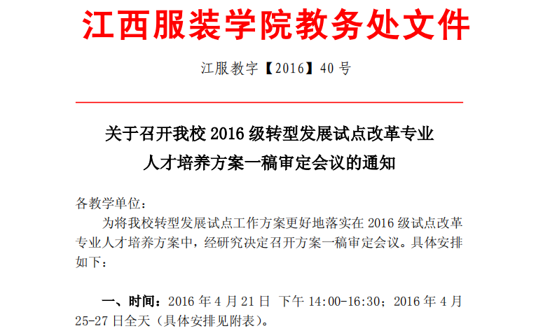 【教学科】关于召开我校2016级转型发展试点改革专业人才培养方案一稿审定会议的通知(江服教字【2016】40号)