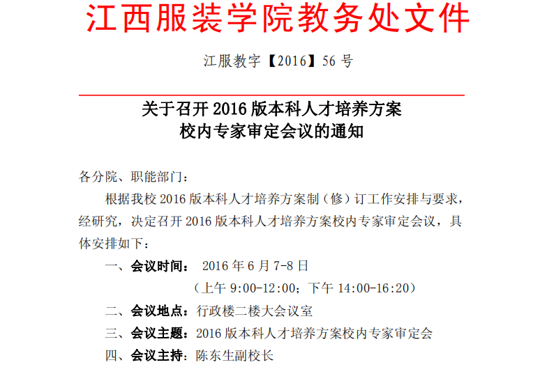 【教学科】关于召开2016版本科人才培养方案校内专家审定会议的通知(江服教字【2016】56号)