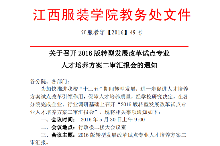 关于召开2016版转型发展改革试点专业人才培养方案二审汇报会的通知(江服教字【2016】49号)