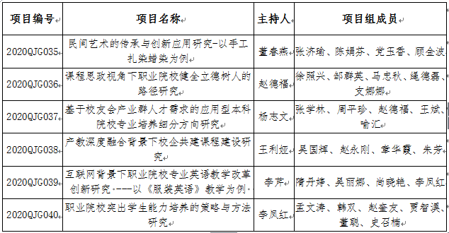 根据《关于开展2020年全国职业教育教学改革研究项目立项工作的通知》(职教改办〔2020〕1号)要求,我校认真组织开展项目申报工作,经各学院(部)推荐,共报送11项教学改革项目。现根据《关于公布2020年全国职业教育教学改革研究立项项目的通知》(职教改办〔2020〕2号)文件通知,我校董春燕副教授等主持的六个项目获批立项,具体立项名单如下: