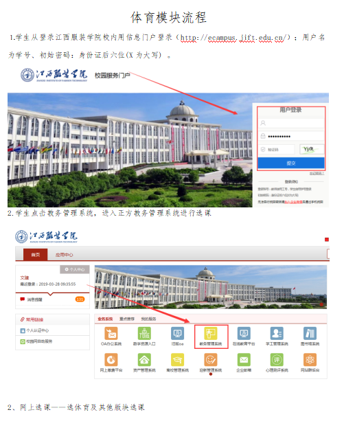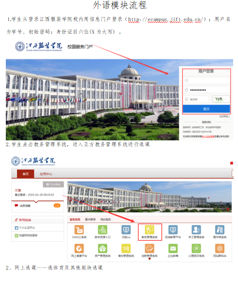 1.登录江西服装学院校园网用户:(http://ecampus.jift.edu.cn),非校园网用户:通过VPN(http://vpn.jift.edu.cn)进江西服装学院信息门户。江西服装学院信息门户使用手册:http://wxzx.jift.edu.cn/info/1005/1040.htm