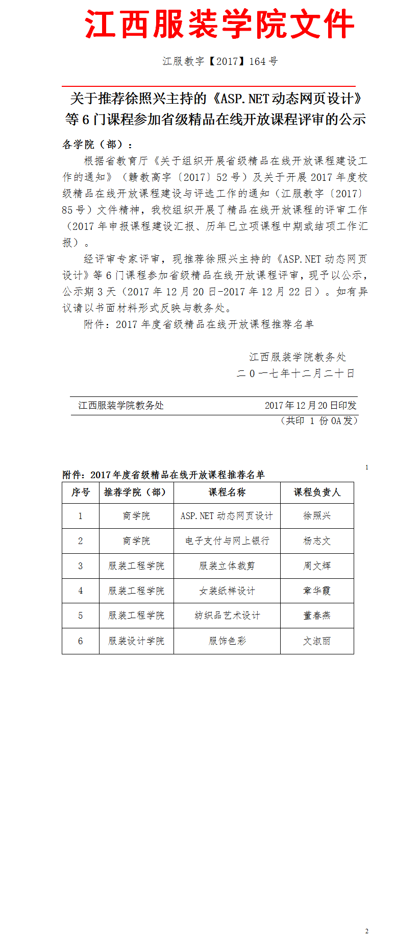 【教学科】关于推荐徐照兴主持的《ASP.NET动态网页设计》等6门课程参加省级精品在线开放课程评审的公示