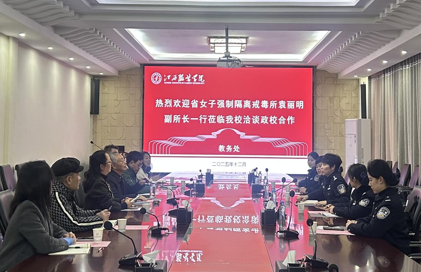 【教务处讯 万文琪撰稿】2025年12月18日上午,江西省女子强制隔离戒毒所副所长袁丽明一行5人莅临我校,在行政楼二楼会议室就深化政校合作、拓展合作领域、实现资源共享等议题展开座谈交流。副校长刘孜杰出席并主持会议,教务处处长及服装设计学院、服装工程学院相关领导参会。