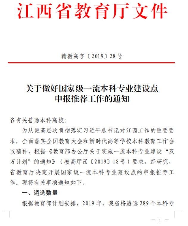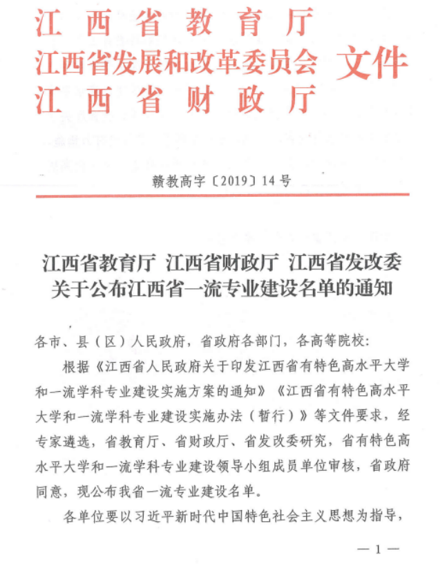 2019年3月26日,江西省教育厅 江西省财政厅 江西省发改委 关于公布江西省一流专业建设名单的通知(赣教高字〔2019〕14号)中公布了江西省一流专业建设名单,全省26所高校共172个专业获评江西省一流专业,我校服装与服饰设计专业名列其中。同时,该专业也被省教育厅推荐参加教育部2019年国家级一流本科专业建设点遴选。