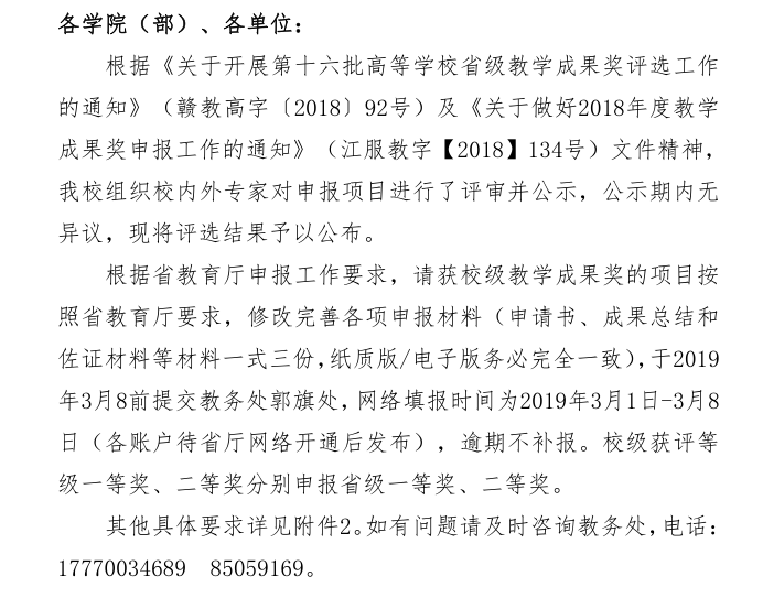 关于公布2018 年度校级教学成果奖评选结果的通知